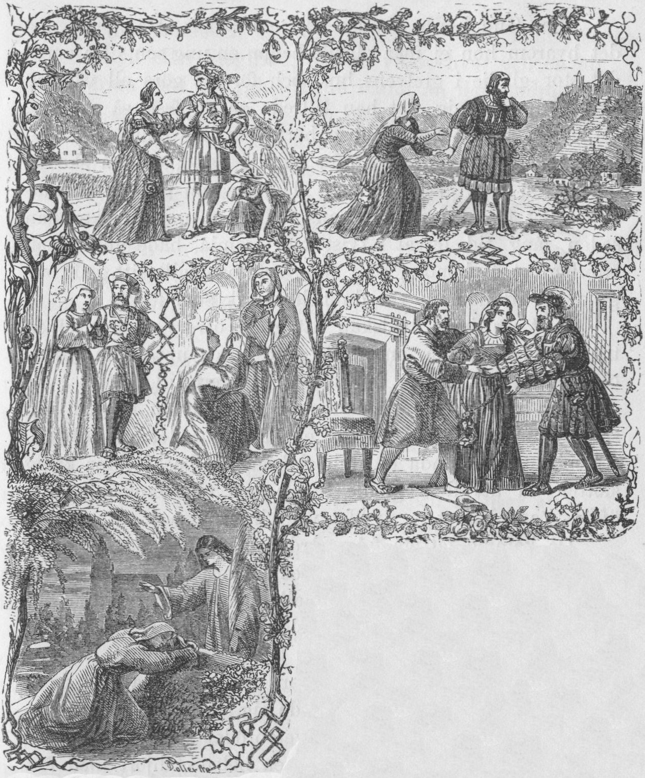 Nu var hon åter allena, och omkring henne rådde tystnaden, men icke grönskade som fordom skogen rundt om henne eller belyste henne solen och månen. Förskräckelse och mörker omgåfvo henne, men icke ens ensamhetens fasor kunde aflocka henne ett ljud. Hon fördes inför domaren och anklagades att med onda konster hafva förtrollat konungen och bragt vanära öfver det kungliga huset. Hon hade födt en trollafföda och öfvat ond trolldom, och allt detta skulle hon nu bekänna. Men den trogna teg; då släpade bödelsknektarne henne till tortyrkammaren och visade henne allt, som där väntade henne; de slogo hennes späda kropp med gissel, men hon teg.