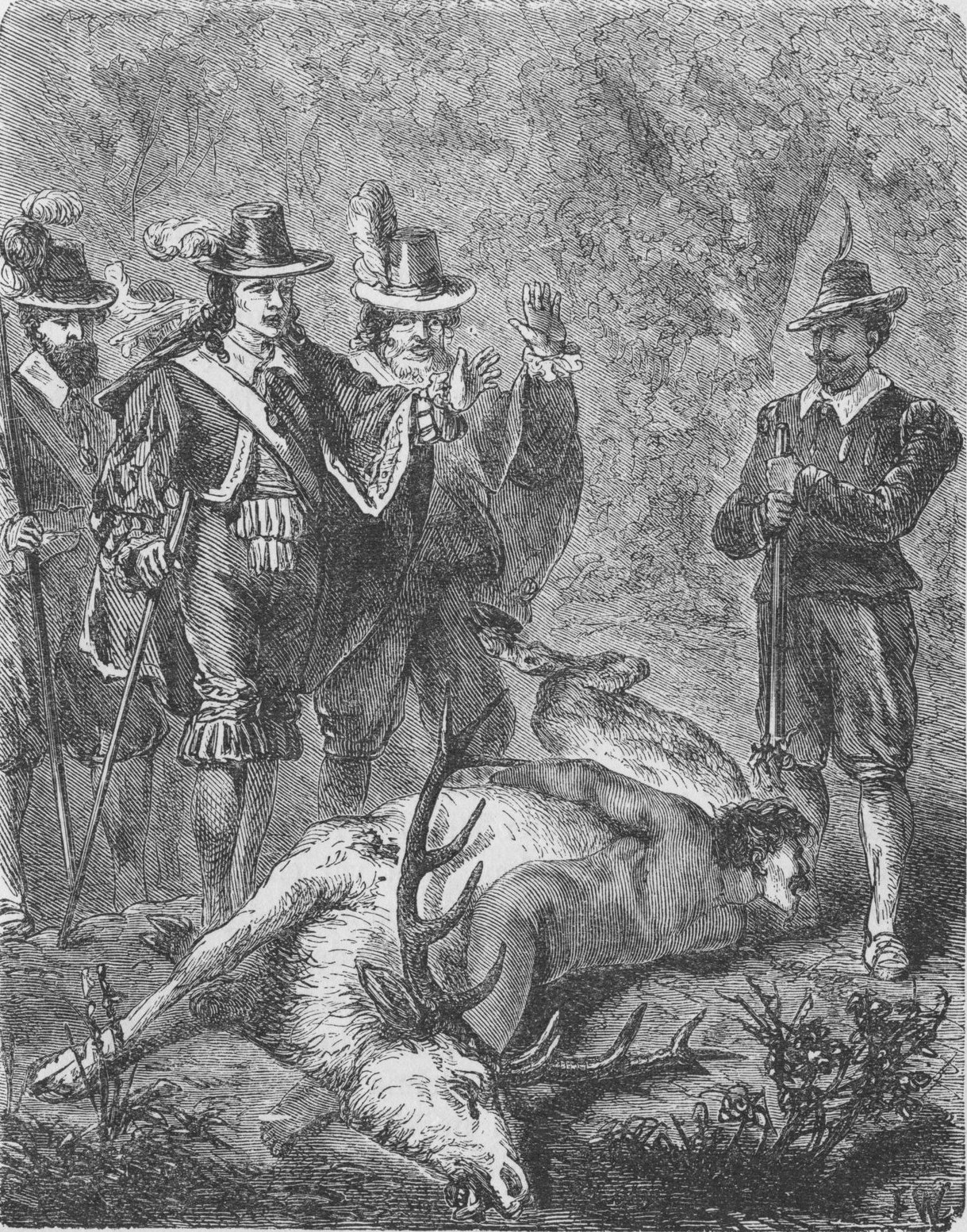 Nu vände sig fursten med vredgad uppsyn till den unge jägaren. »Ett svårt brott är här begånget ... blott du förmår lämna upplysning om detsamma. Tala alltså, unge man! hvad har skett?»