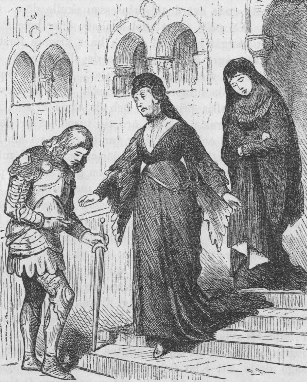 Domen lades för konungen, att han skulle underskrifva den. Då vred han sig i sin smärta och sina kval, ty han ville ej höra något därom, ville ej bidraga till att hans älskade skulle dödas. Hans systrar gräto med honom, ty de hade medlidande med hans kval; men deras hjärtan voro fångna af vantro, ty äfven de höllo drottningen för en häxa och ville hennes död. Därefter sade de till sin broder: »Käre, trösta dig; din smärta skall ej räcka länge. Se, ännu håller häxan med sina trollfjättrar din själ fången och hennes bedrägliga behag lägga en dimma öfver dina ögon. Men när elden har förtärt hennes syndiga kropp, då skall du blifva fri och löst ifrån trolldomen.»